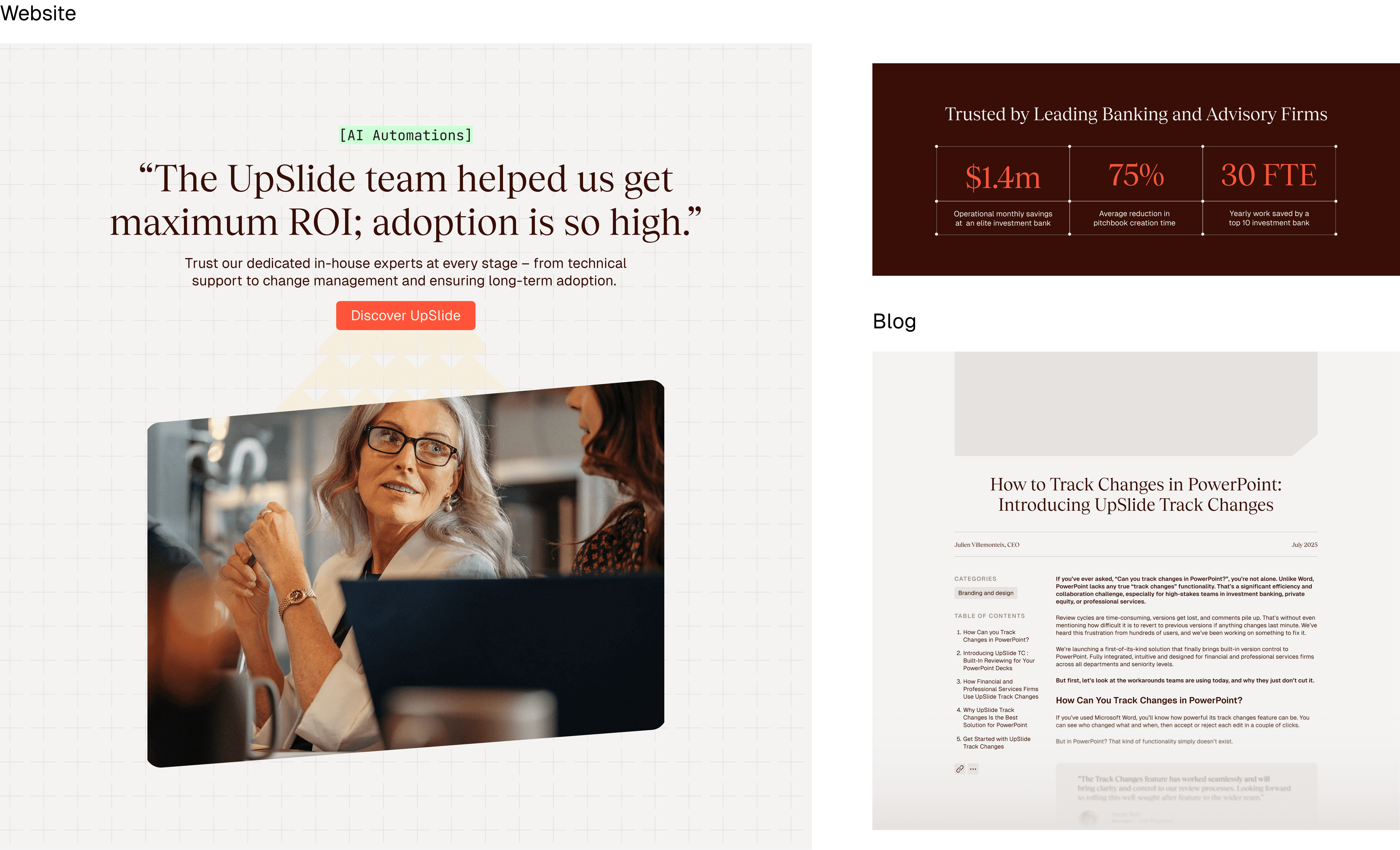 The current brand felt too playful, not premium or tech-forward enough for our enterprise audience. But I wanted to preserve UpSlide's warmth - we have 13+ years of expertise, strong client relationships. Clients know and trust us. The goal: retain personality while elevating perceived expertise.